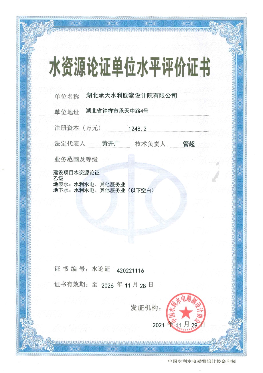 水资源论证单位水平评价证书